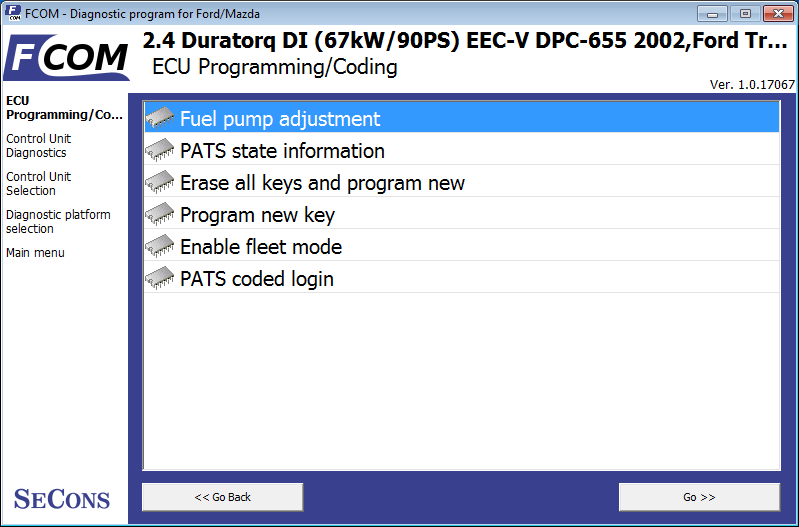 Über FCOM eine Verbindung zum Motorsteuergerät (PCM) herstellen. Die Funktion „Kraftstoffpumpeneinstellung“ finden Sie im Menü „ECU-Programmierung/Codierung“. Die Auswahl weiterer Codierfunktionen wie PATS-Login, Löschschlüssel usw. ist für die Kraftstoffpumpeneinstellung nicht erforderlich.
