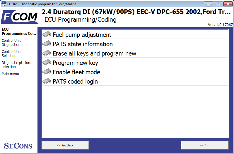PATS-Funktionen sind in der Diagnosesitzung für PCM- und IPC-Steuergeräte im Programmier-/Codierungsmenü verfügbar. Für Benutzer, die mit der Ford IDS-Diagnose vertraut sind, haben wir zum Vergleich Screenshots von Ford IDS beigefügt.