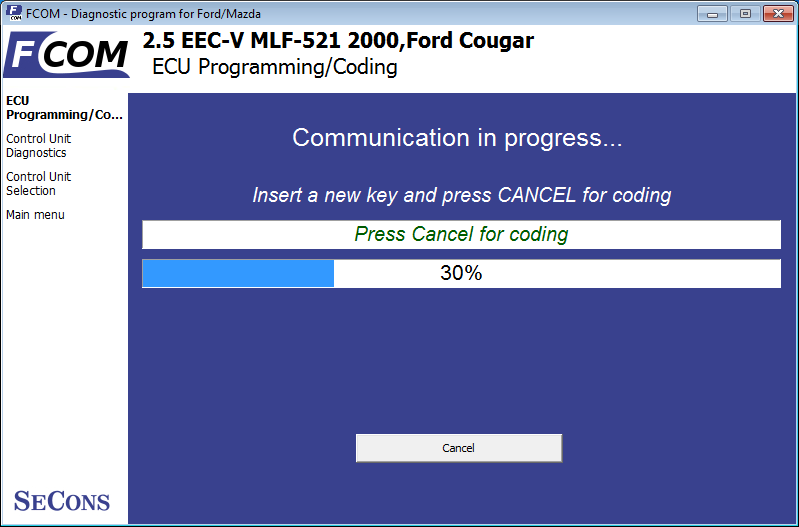 Sie können den laufenden Countdown abbrechen, indem Sie auf die Schaltfläche „Abbrechen“ klicken. Während FCOM darauf wartet, dass das Steuergerät entriegelt wird, kommuniziert es mit dem Steuergerät und daher muss die Zündung eingeschaltet werden.