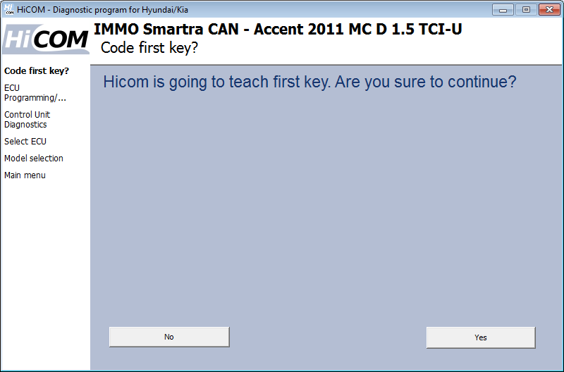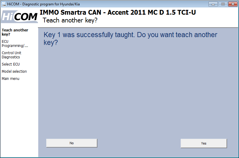 Sie werden gefragt, ob Sie einen weiteren Schlüssel codieren möchten. Wenn Sie auf „Ja“ klicken, werden Sie von HiCOM aufgefordert, den nächsten Schlüssel einzufügen. Es können bis zu 4 Schlüssel codiert werden (einige Steuergeräte erlauben Einheiten mit bis zu 8 Schlüsseln). Wenn Sie auf „Nein“ klicken, wird der Codiervorgang abgebrochen und es werden keine weiteren Schlüssel hinzugefügt.